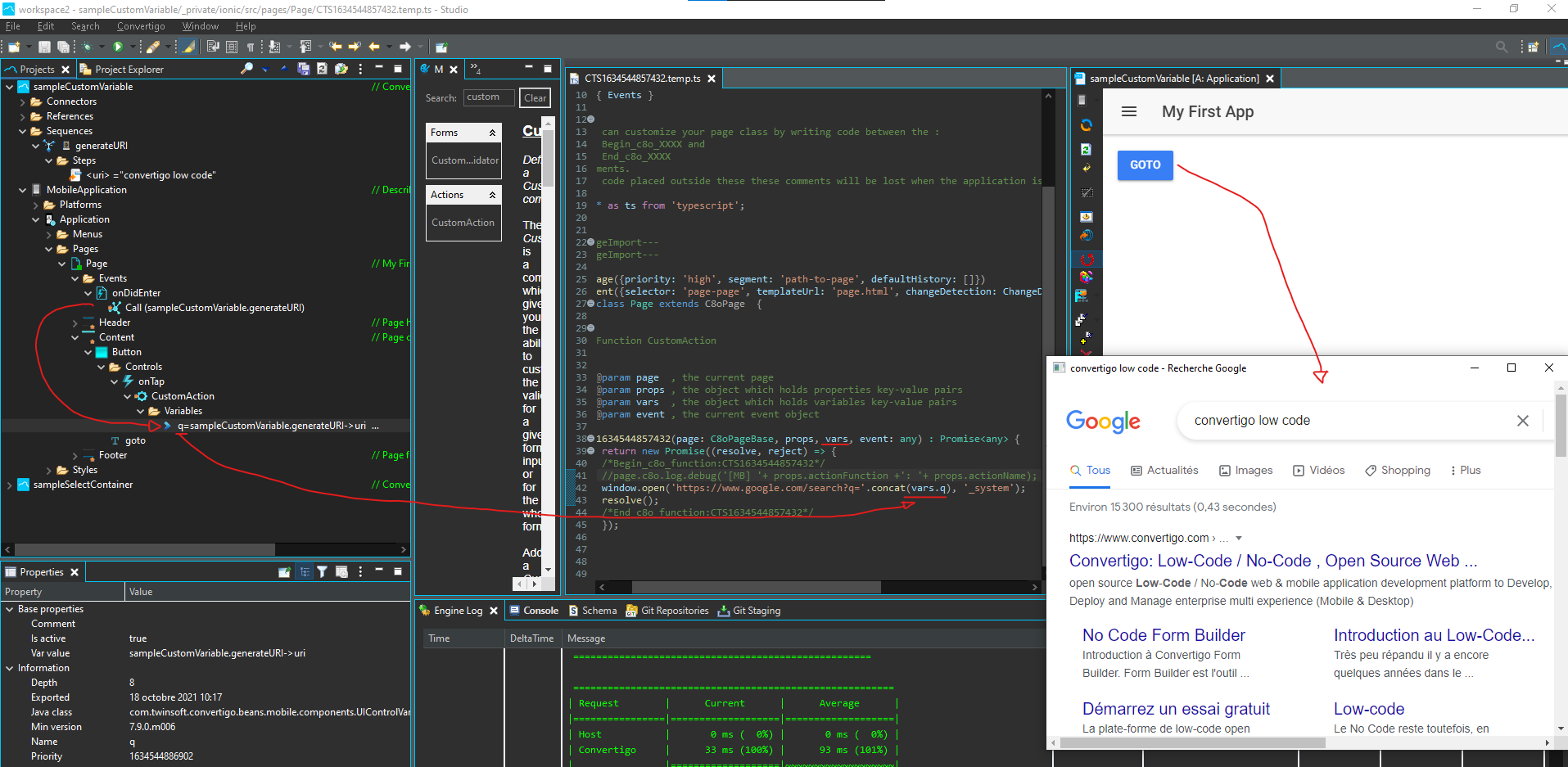 You can pass variables to custom actions. When you use a custom action, you can add Variable to the custom action. The variable value can be accessed within the custom action by a :
