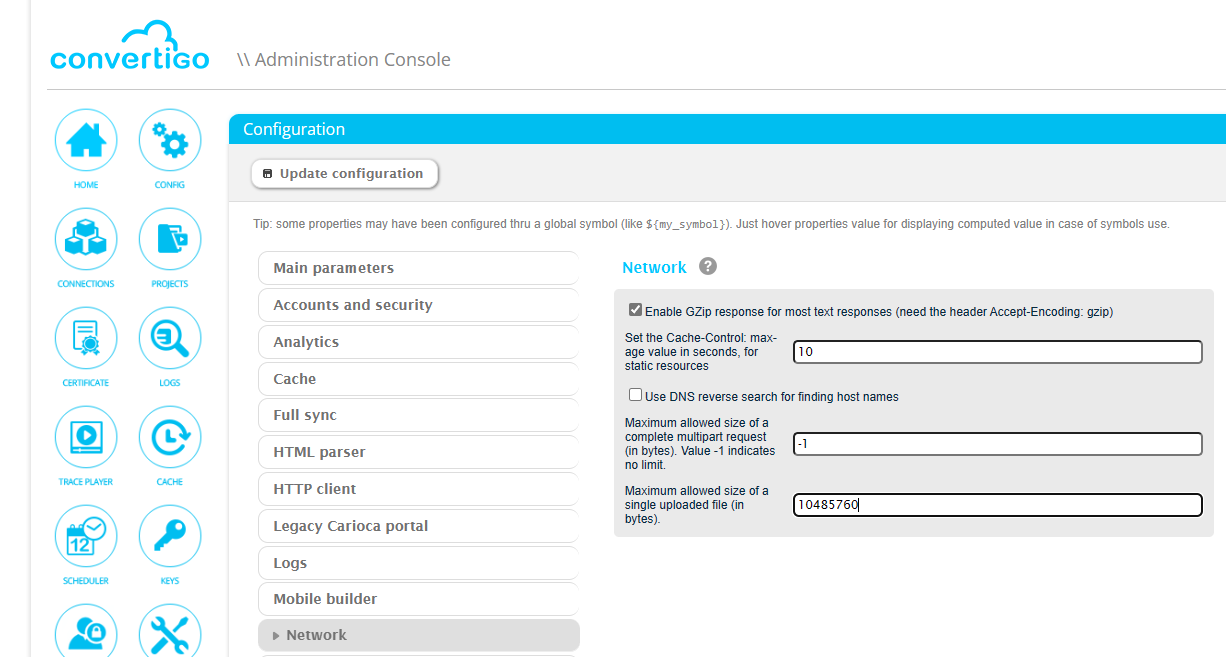 To change this value go to Administration Console → CONFIG → Network and change values accordingly: