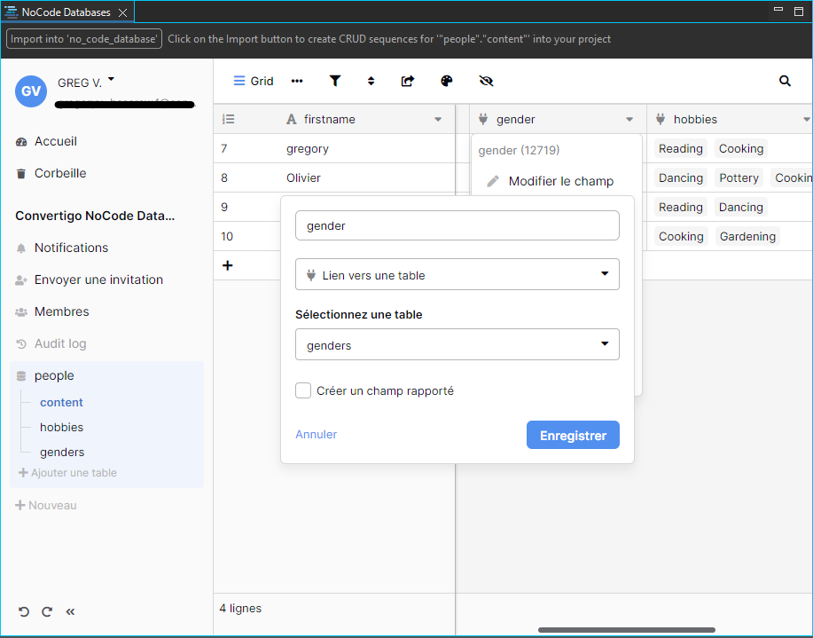 In Convertigo NoCode database, columns of a table can be linked to another table, accepting one or more values: