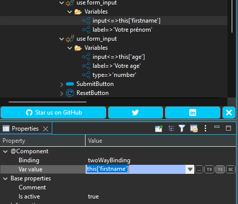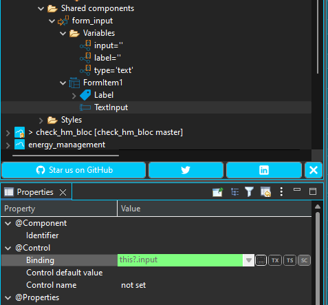 The Binding property of the Form element has to be associated to a variable of the sharedComponent ('input' in the sample project):