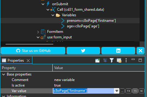Form values to transmit to a back end sequence, for example, have to be mapped in TS mode of the following form: c8oPage['<whatever_variable_name>']